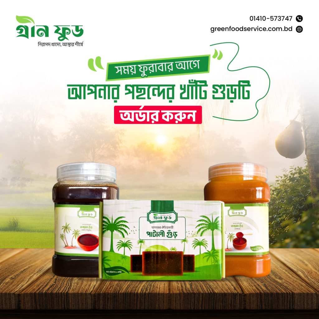 শীতের ভোরের টাটকা জিরান এবং বিশুদ্ধ রস থেকে তৈরি ১০০% খাঁটি Green Food-এর প্রিমিয়াম খেজুর গুড়।